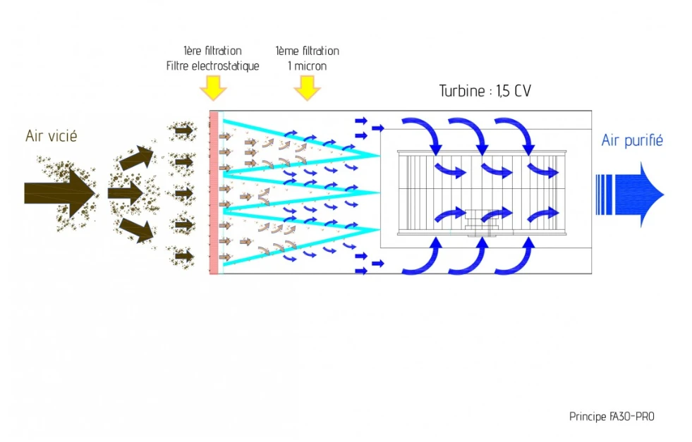 - Il est équipé de deux filtres dont un filtre électrostatique permettant d’éliminer 98% des particules de plus de 5μ et 85% de 1μ.