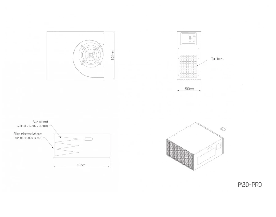 - Le système de filtration air FA30-PRO est conçu pour éliminer la plupart des poussières en suspension dans l’air lors du travail du bois en atelier.