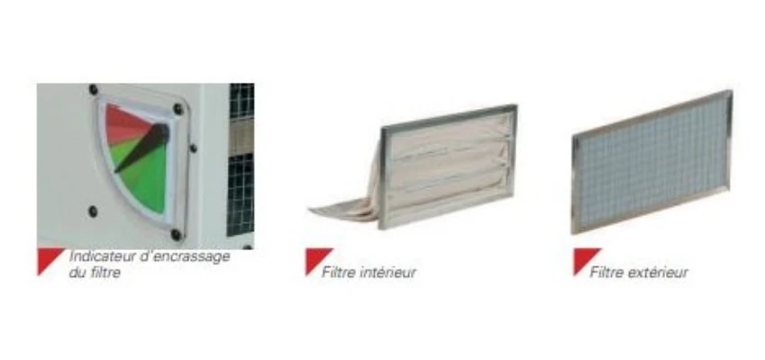 - Les filtres se démontent sans outils. Le premier filtre est lavable. Il est muni d’un indicateur d’encrassage des filtres.