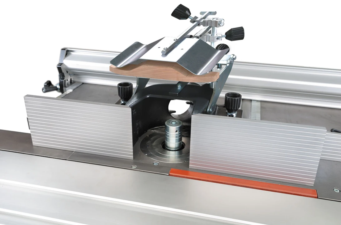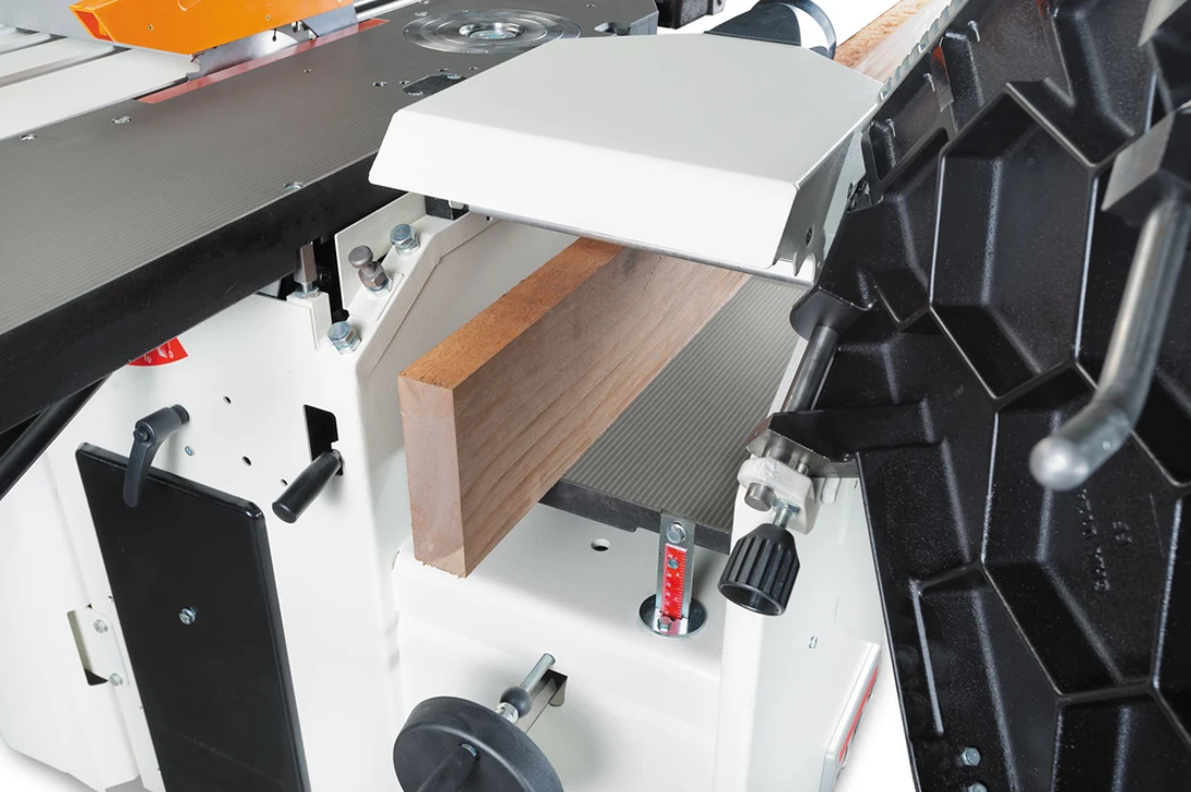- Le protecteur de toupie est en fonte et équipé d’origine d’un double système de réglage micrométrique.