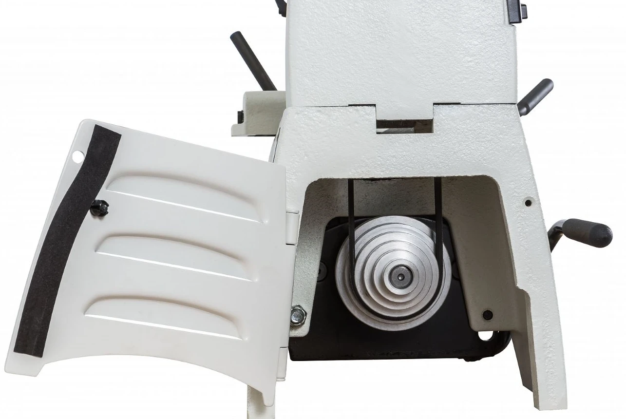 Réglage des vitesses par poulies étagées avec changement et tension rapide.