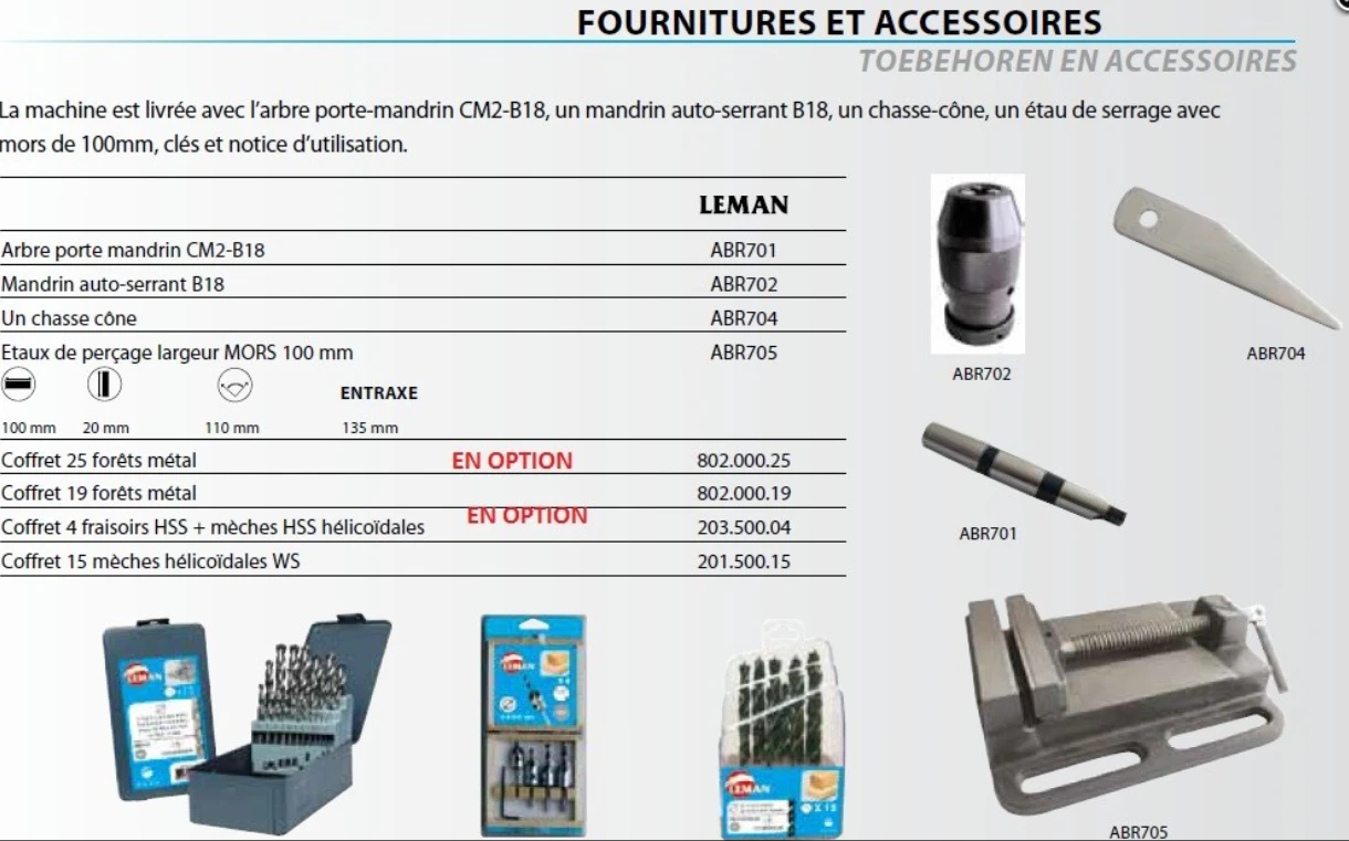 - L’arbre porte-mandrin CM2-B18, un mandrin auto-serrant B18, un chasse-cône, un étau de serrage avec mors de 100mm, clés et notice d’utilisation.