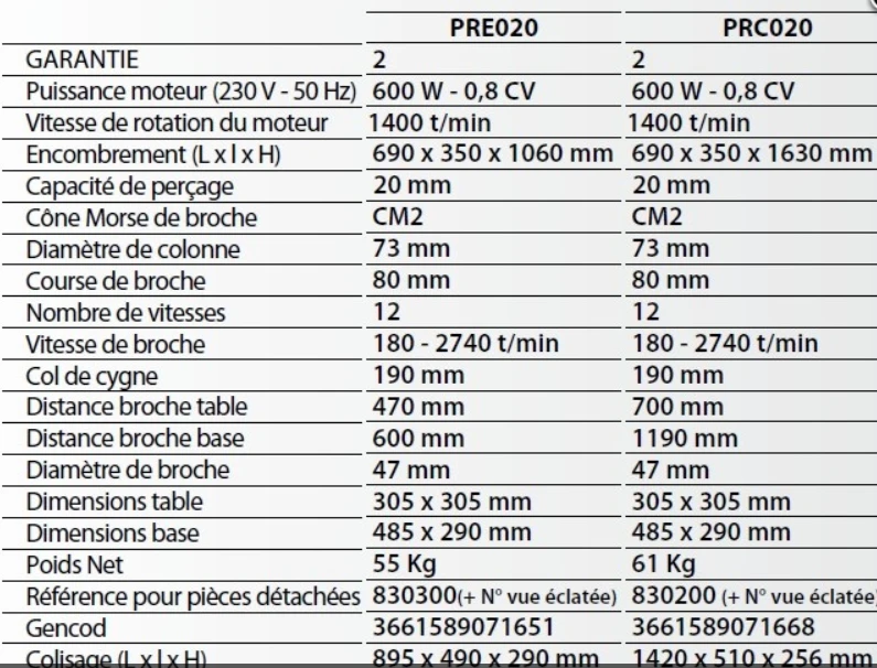 - Base percée pour pouvoir fixer la machine au sol (PRC020) ou sur un établi (PRE020).