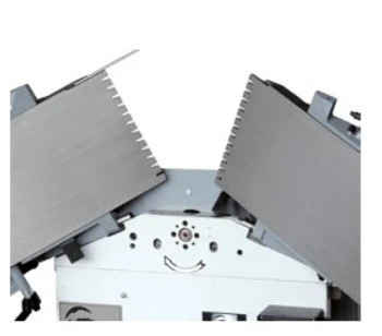 - Guide d’onglet monté sur la table de chariotage, réglable à +ou-45° et équipé d’une butée de longueur pour les coupes répétitives.