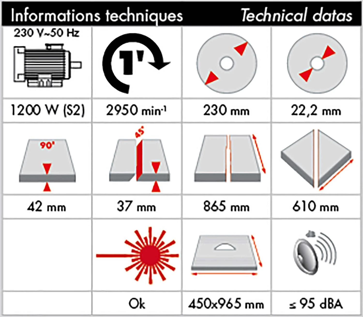 | Capacité maximum de coupe à 90° / 45° | 42 mm / 37 mm |