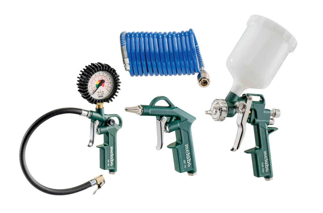 - Ensemble composé d’une soufflette, d’un pistolet de gonflage des pneus, d’un pistolet à peinture avec godet et d’un flexible spiralé en PA