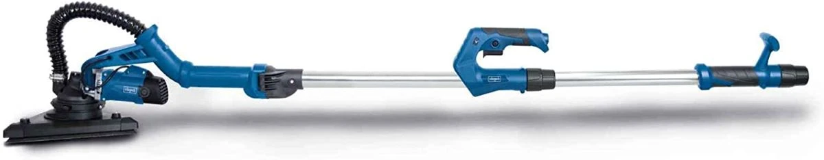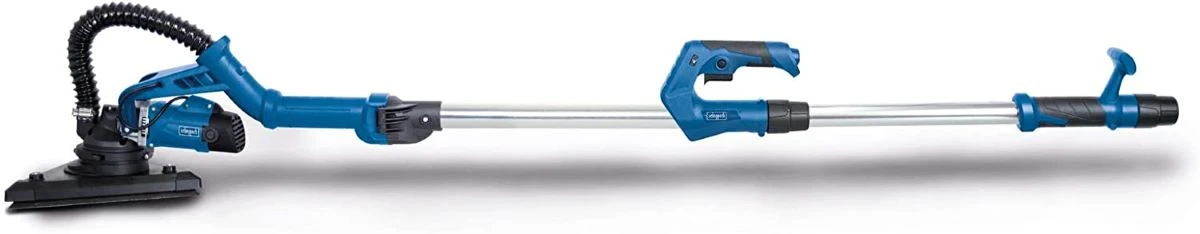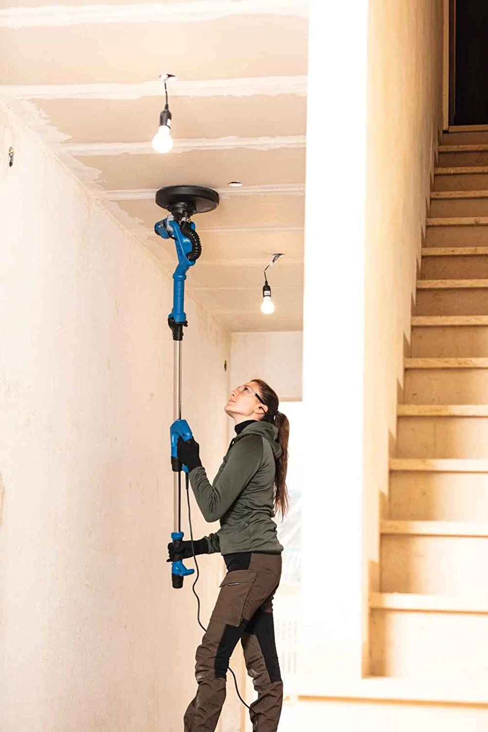 La ponceuse DS930 Scheppach permet de poncer les mûrs et les plafonds. Grâce à l’orientation de sa tête de 0° à 90°, le ponçage des plafonds peut être réalisé directement depuis le sol grâce à sa tête large et orientable.