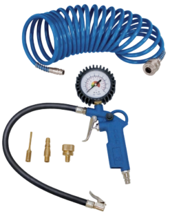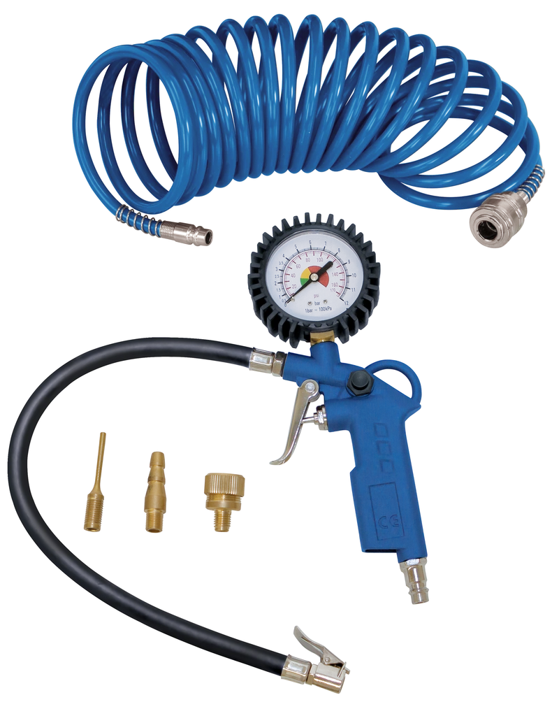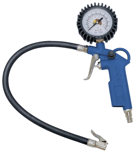 - Un pistolet de gonflage avec un manomètre à affichage en bar/psi, protégé par une coque en caoutchouc et équipé d’un bouton de dégonflage
