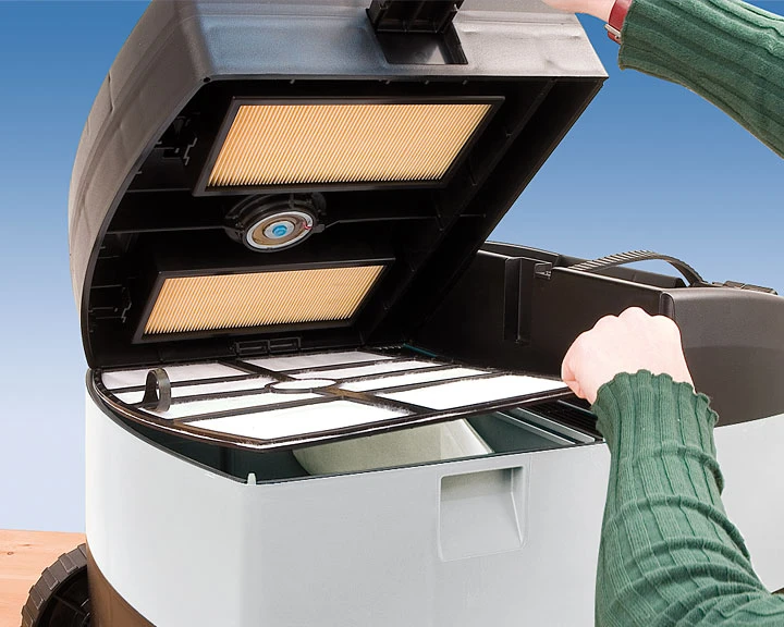 - Son double système de filtration est doté d’un vibreur automatique du filtre fin décolmatant la poussière accumulée ainsi que d’une prise pour une utilisation en mode soufflant