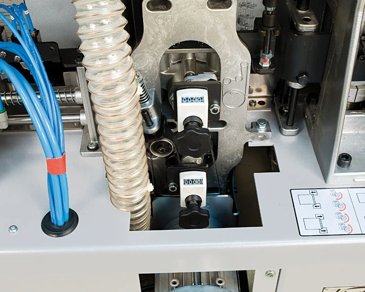 - Molette triple réglage: ouverture du guide chant, alignement des règles d’entrée et alignement du rouleau applicateur de colle.
